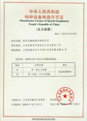 我公司压力容器制造许可证换证工作顺利通过,其中设计制造压力100KG以内不锈钢压力容器、换热器属此次换证的新增项目, 上述制造许可能力的认证填补了公司生产此类压缩机配套所需的压力容器产品的空白,具有较高的市场竞争力。