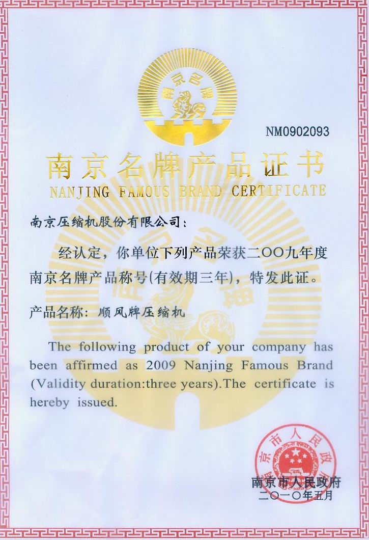 2010年5月,南京市政府授予我公司”顺风牌“压缩机“南京市名牌产品”称号。